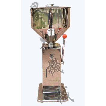該灌裝機(jī)容量為50g, 使用時旋轉(zhuǎn)容量調(diào)節(jié)鈕,觀看刻度表。指針對準(zhǔn)你所需灌裝的容量,然后扳動手柄試灌裝。